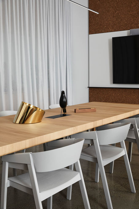 The lounge is furnished with carefully curated designer furniture and materials which create a relaxed, residential ambience. These include the use of a Walter Knoll dining table converted into a boardroom table, with Muuto dining room chairs, along with uncommon boardroom features such as pendant lighting and sculptures.